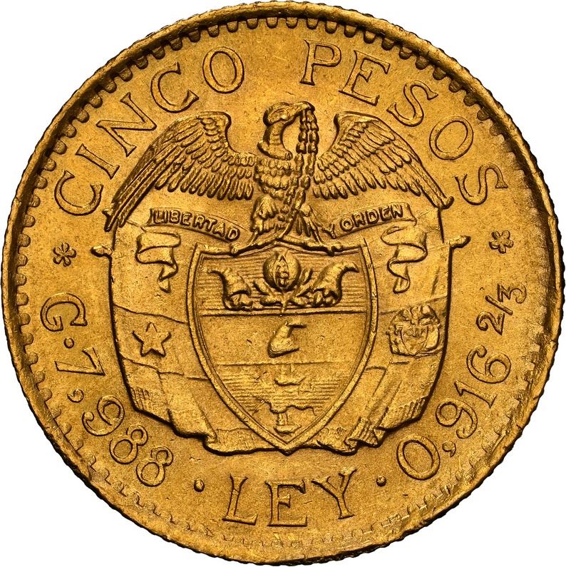 COLOMBIA, Medellín, gold 5 pesos, 1925, 5 in date with die-crack, NGC MS 63, ex-JEAS. Restrepo-455.4c; Sed-54; KM-204; Fr-115. Satin surfaces with cartwheel luster, crazy-looking 5 in date due to such a significant die-crack that it has its own listing in Restrepo. Pedigreed to the JEAS Collection.