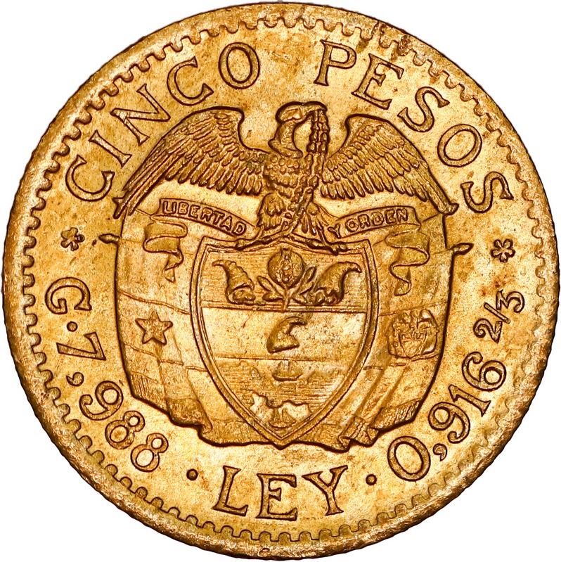 COLOMBIA, Medellín, gold 5 pesos, 1926, 2/2 in date, NGC MS 64, ex-JEAS. Restrepo-455.5a; Sed-54; KM-204; Fr-115. Satin surfaces with cartwheel luster, clearly re-punched 2 in date. Pedigreed to the JEAS Collection.