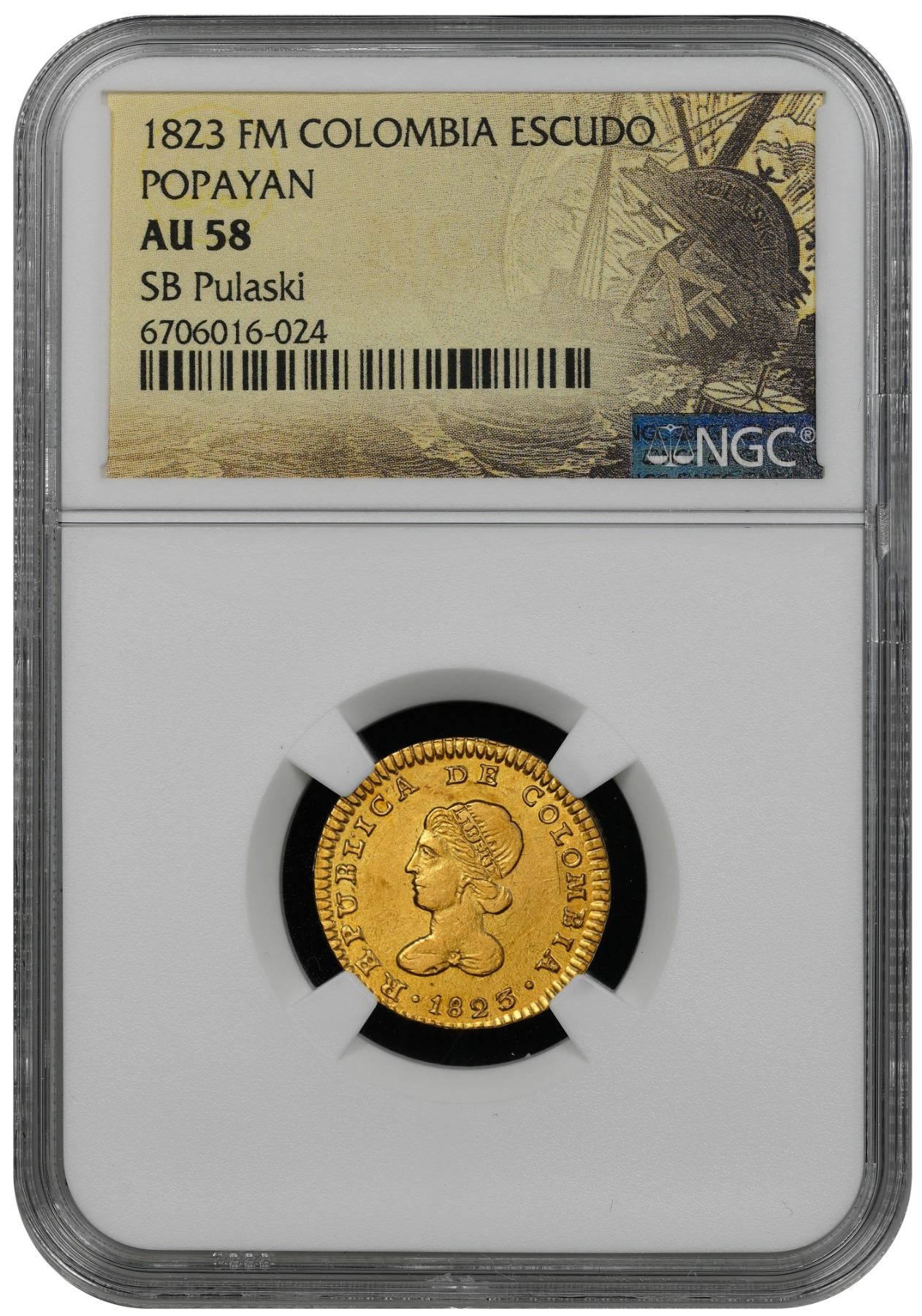 COLOMBIA, Popayán, gold 1 escudo, 1823 FM, NGC AU 58 (SB Pulaski Shipwreck Label). Restrepo-162.1; KM-81.2; Fr-72. S.B. Pulaski shipwreck coins are among the earliest and rarest of all U.S. shipwreck recoveries. The steam packet Pulaski, carrying 187 passengers and crew, left the port of Charleston, South Carolina, on June 14, 1838, bound for Baltimore, Maryland. Around 11 PM that night, off the coast of North Carolina, the starboard boiler exploded. Some were killed in the blast, while others were lost as the ship quickly went down; around 59 survivors were saved. Unlike the other larger U.S. shipwreck recoveries, where big quantities of coins from commercial shipments were recovered, coins from the Pulaski were wholly passenger and crew "pocket change." The find uncovered Mint State U.S. gold coins, a number of U.S. silver coins (mostly half dollars), and many foreign coins that were U.S. legal tender at the time, like this one. Lustrous piece with just the slightest of surface friction and bold design elements throughout. Recovered from: S.B. Pulaski, sunk in 1838 off North Carolina