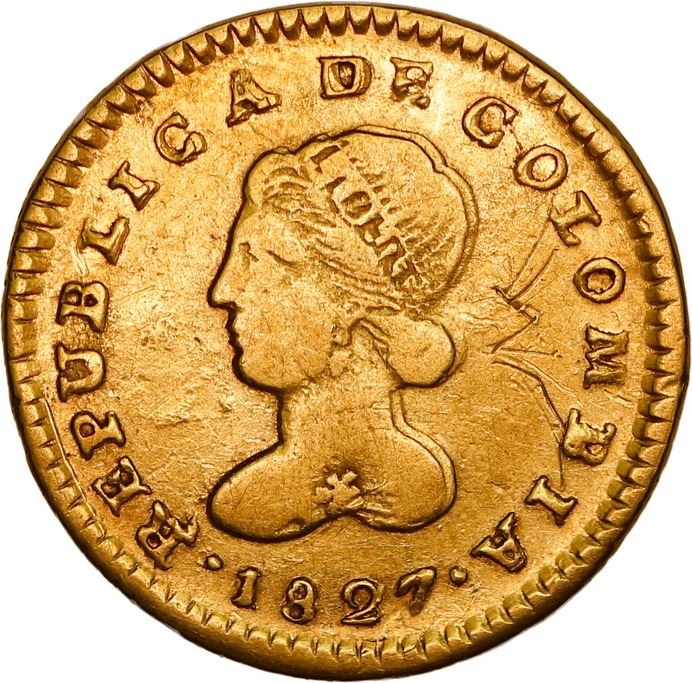 COLOMBIA, Popayán, gold 1 escudo, 1827 RU, doubled-die obverse, ex-JEAS. Restrepo-162.12 var; Sed-3; KM-81.2, Fr-72. 3.30 grams. Well-struck AXF with hairlines from cleaning, graffiti scratched into field behind head, but potentially important as a new variety with the obverse die doubled (most noticeable on Liberty's bust but also in the date), listed in Restrepo for 1826 but not this subsequent date. Pedigreed to the JEAS Collection.