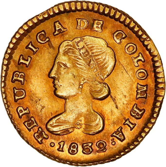 COLOMBIA, Popayán, gold 1 escudo, 1832 RU, ex-JEAS. Restrepo-162.27; Sed-3; KM-81.2, Fr-72. 3.66 grams. UNC with attractive toning over luster, full rims but with bruise or natural flaw on reverse. Pedigreed to the JEAS Collection.
