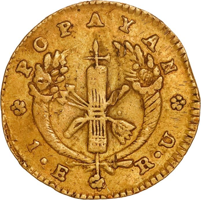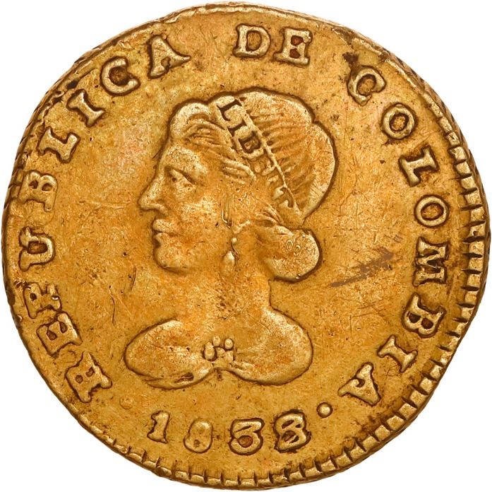 COLOMBIA, Popayán, gold 1 escudo, 1833/2 RU, ex-JEAS. Restrepo-162.28; KM-81.2. 3.13 grams. VF piece with clear overdate, matte surfaces with light surface marks. Pedigreed to the JEAS Collection.