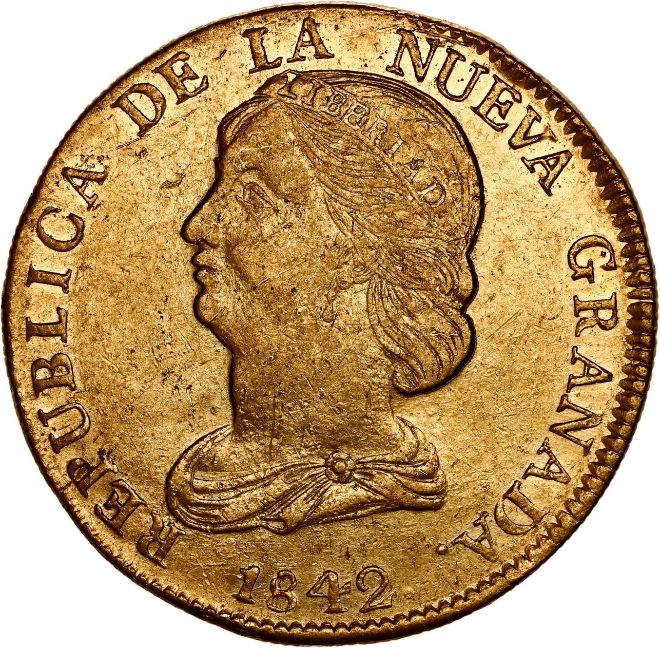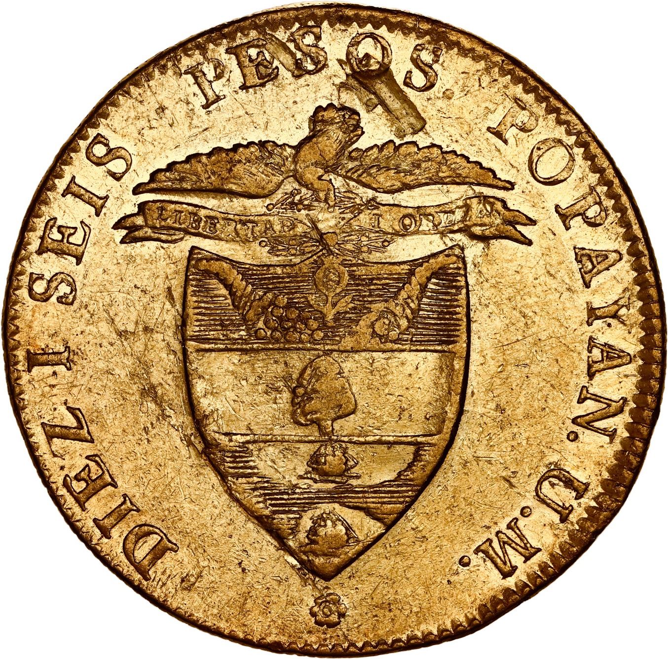 COLOMBIA, Popayán, gold 16 pesos, 1842 UM, U/M , ex-JEAS. Restrepo-212.14; Sed-unl (19 for type); KM-unl (94.2 for type); Fr-75. 26.90 grams. Lustrous AU with light marks, lamination flaws on reverse, clear U/M in assayer (missing in Eldorado), AGW 0.7596 oz. Pedigreed to the JEAS Collection.