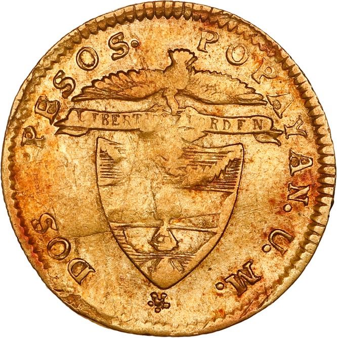 COLOMBIA, Popayán, gold 2 pesos, 1844 UM, ex-JEAS. Restrepo-202.9; KM-95. 3.10 grams. VF with several marks on the obverse, patches of red-gold toning scarce. Pedigreed to the JEAS Collection.