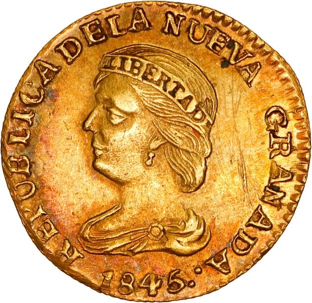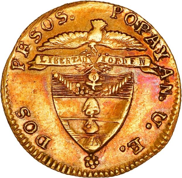 COLOMBIA, Popayán, gold 2 pesos, 1845 UE, rare, ex-JEAS. Restrepo-202.13; Sed-10; KM-96; Fr-76. 3.36 grams. AU with areas of deep rainbow toning, scratches behind head and filing on rims, rated RR in Sedwick. Pedigreed to the JEAS Collection.