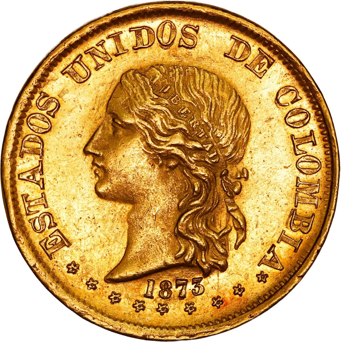 COLOMBIA, Popayán, gold 20 pesos, 1873, ex-JEAS. Restrepo-339.10; Sed-46; KM-142.3; Fr-100. 32.14 grams. Bold AU with strong luster, faint hairlines, scarce and popular type (this date rated RRR in Sedwick but not noted as rare in Restrepo). Pedigreed to the JEAS Collection.