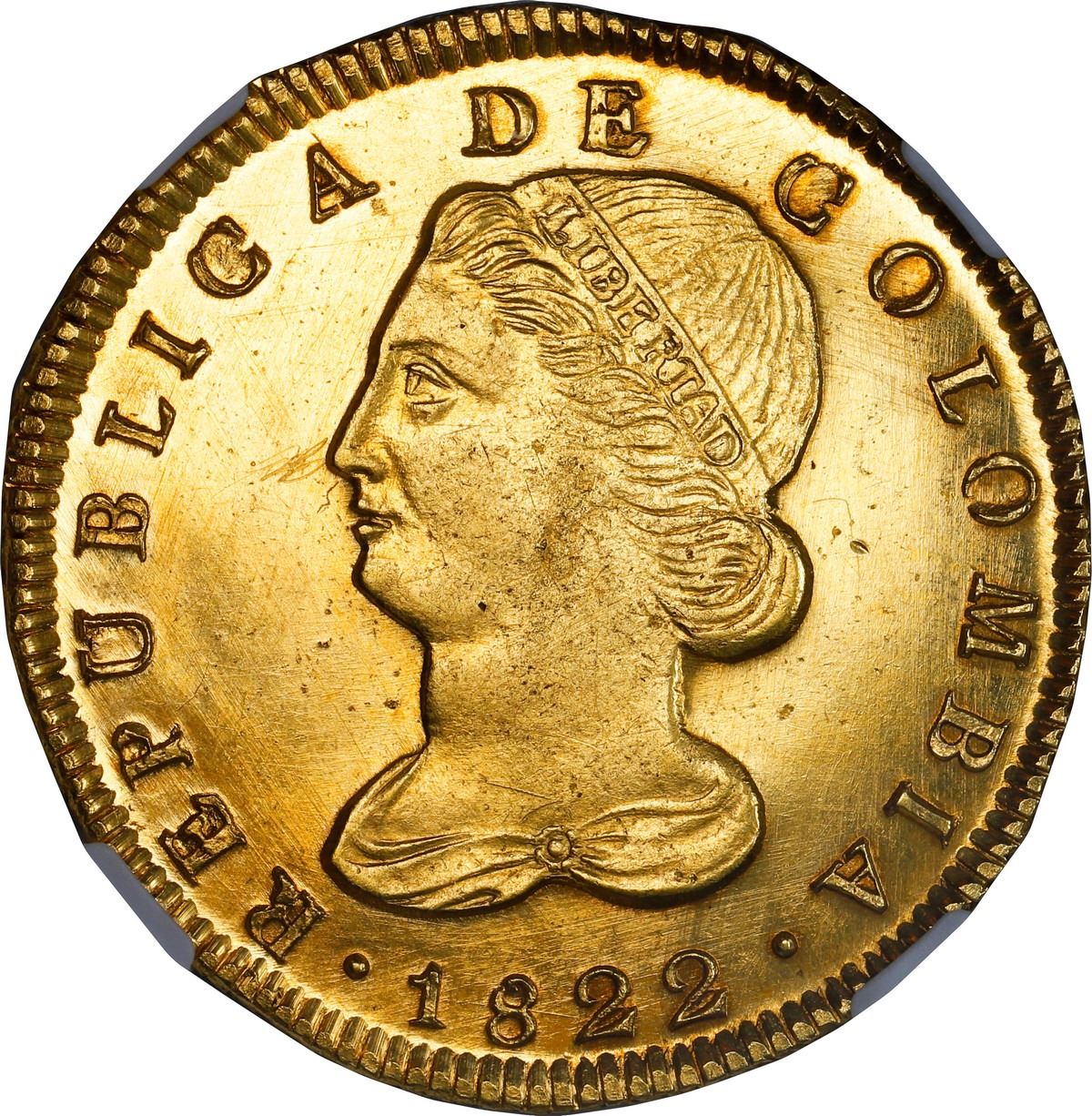 COLOMBIA, Popayán, gold 8 escudos, 1822 FM, rare, NGC MS 61, ex-Sedwick. Restrepo-166.1; Sed-7, KM-82.2; Fr-68. Superb strike with choice details and full rims, eye-popping luster, the obverse a bit hairlined but very attractive nonetheless, currently tied with one other for second finest in the NGC census, rare first date of type (RR in Sedwick). Pedigreed to the Dr. Frank Sedwick Collection (Sedwick Auction 9, lot 239), stated on label.