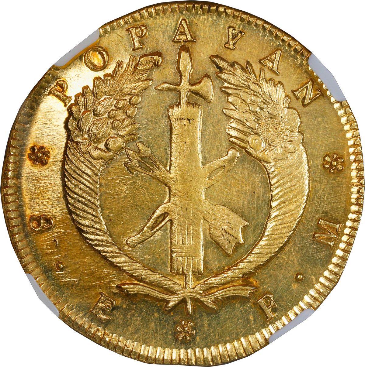 COLOMBIA, Popayán, gold 8 escudos, 1822 FM, rare, NGC MS 61, ex-Sedwick.