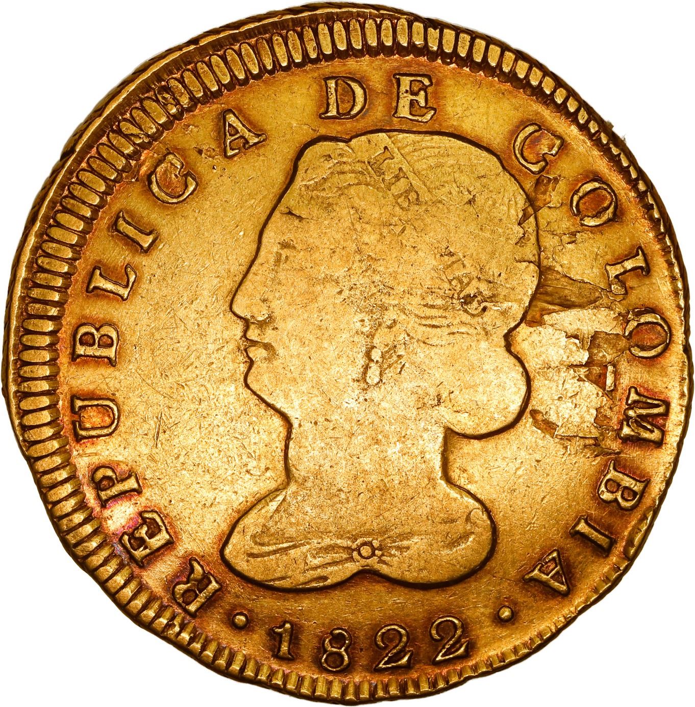 COLOMBIA, Popayán, gold 8 escudos, 1822 FM, rare, ex-JEAS. Restrepo-166.1; Sed-7, KM-82.2; Fr-68. 26.80 grams. Off-center strike with crude rims, colorfully toned legends with some luster, weaker interiors with laminations behind head, net VF. Pedigreed to the JEAS Collection.