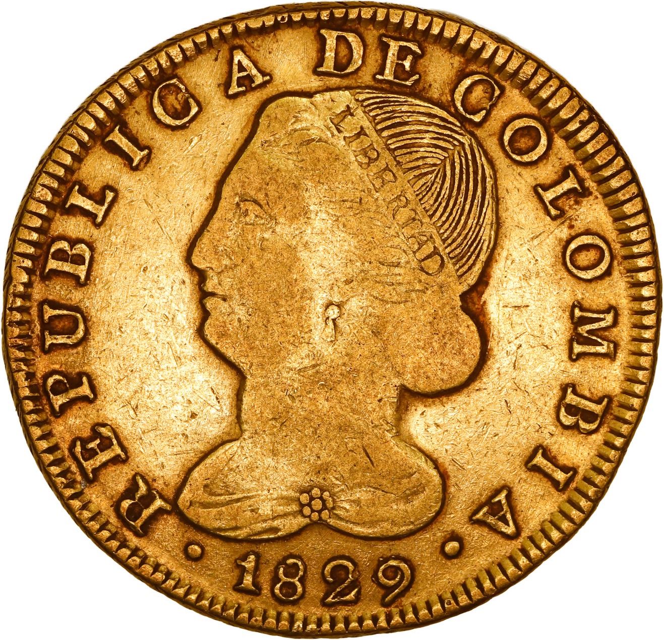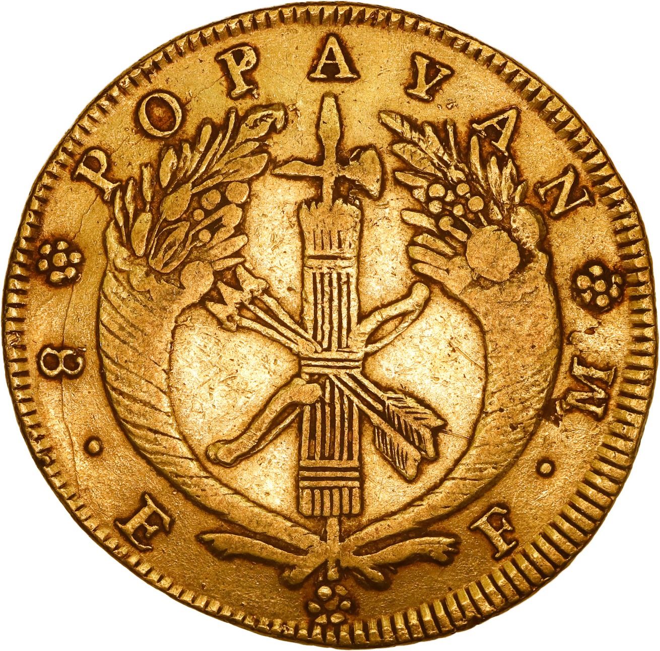 COLOMBIA, Popayán, gold 8 escudos, 1829 FM, rare, ex-JEAS. Restrepo-166.21; Sed-7; KM-82.2; Fr-68. 26.99 grams. VF with deep toning around details, full rims, nice aspect for the grade, rated RR in Sedwick. Pedigreed to the JEAS Collection.