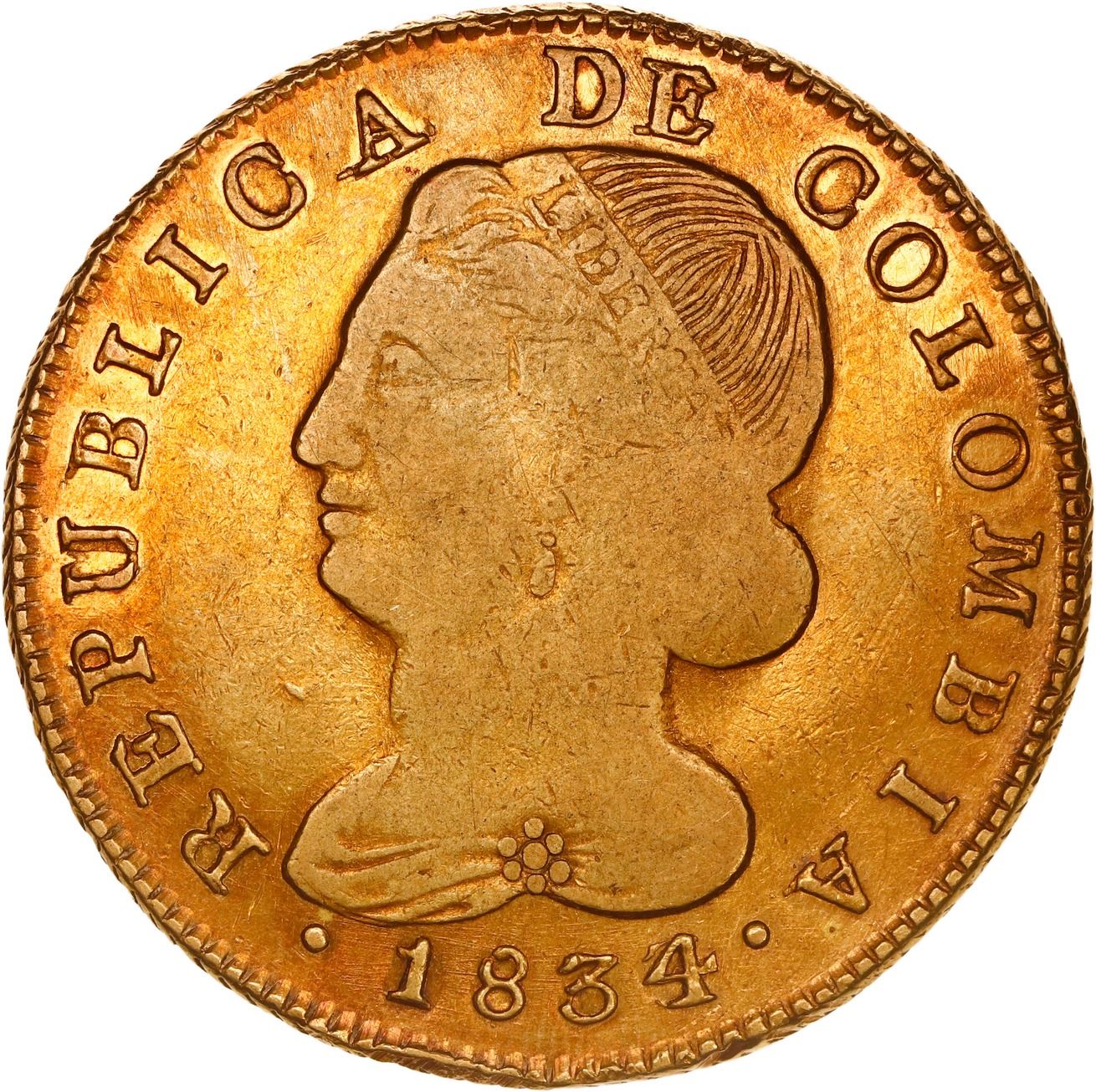 COLOMBIA, Popayán, gold 8 escudos, 1834/3 UR, ex-JEAS. Restrepo-166.36; KM-82.2. 26.87 grams. VF+ with a weak bust, clear overdate, nice lustrous fields with deep red toning, scarce date. Pedigreed to the JEAS Collection.