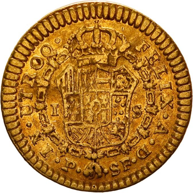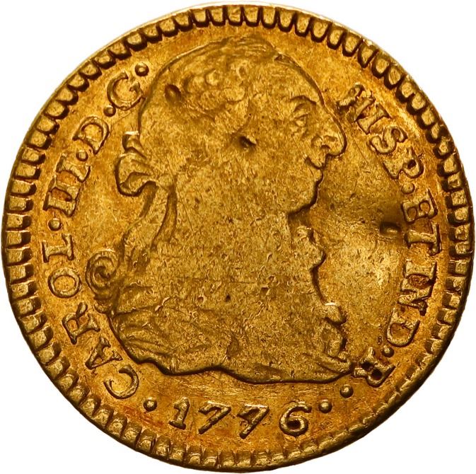 COLOMBIA, Popayán, gold bust 1 escudo, Charles III, 1776 SF. Restrepo-54.8; KM-48.2; Cal-1419; Fr-42. 3.32 grams. VF with slight bend and marks on the bust, popular date with U.S. collectors.