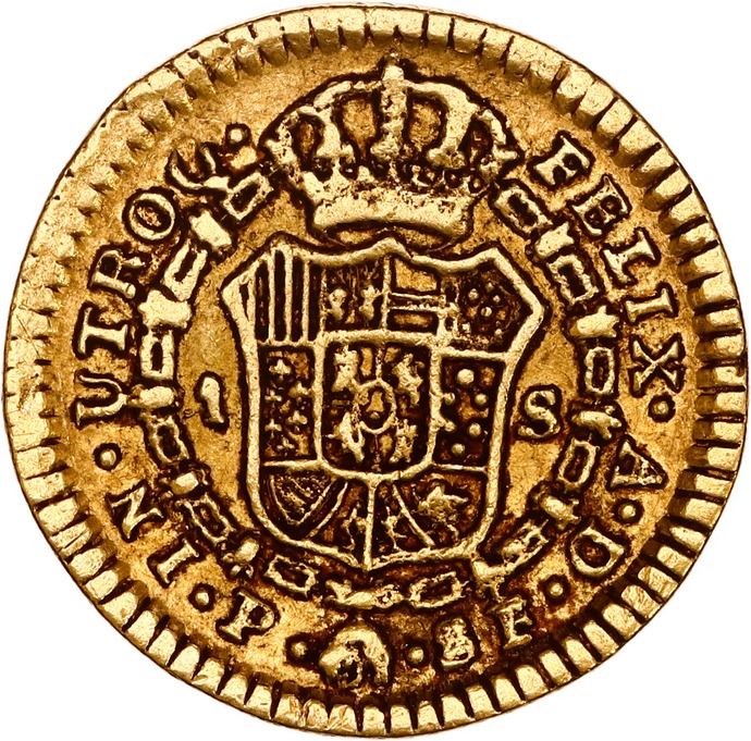COLOMBIA, Popayán, gold bust 1 escudo, Charles III, 1778 SF, ex-JEAS. Restrepo-54.12; KM-48.2; Cal-1421. 3.34 grams. VF/XF, dark sedimentation around the details. Pedigreed to the JEAS Collection.