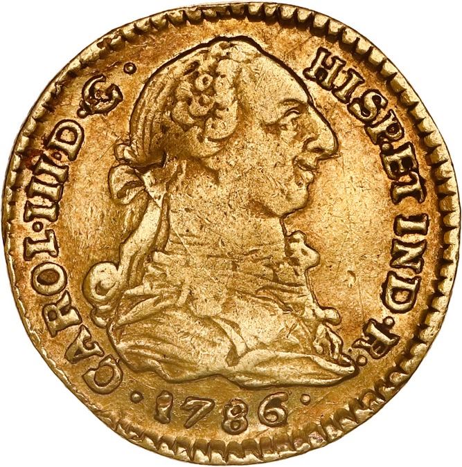 COLOMBIA, Popayán, gold bust 1 escudo, Charles III, 1786 SF, ex-JEAS. Restrepo-54.30; KM-48.2a; Cal-1431. 3.33 grams. XF with small dent in bust. Pedigreed to the JEAS Collection.