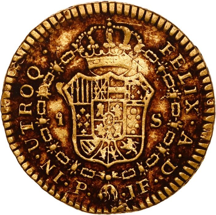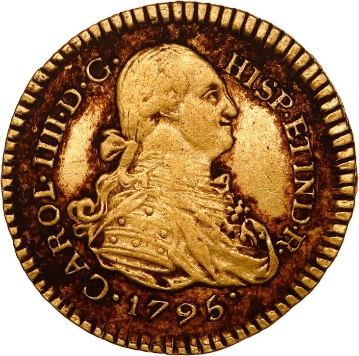 COLOMBIA, Popayán, gold bust 1 escudo, Charles IV, 1795 JF, ex-JEAS. Restrepo-85.8; KM-56.2; Cal-1153. 3.36 grams. XF with dark surface encrustation cameo, lightly wiped across the bust. Pedigreed to the JEAS Collection.