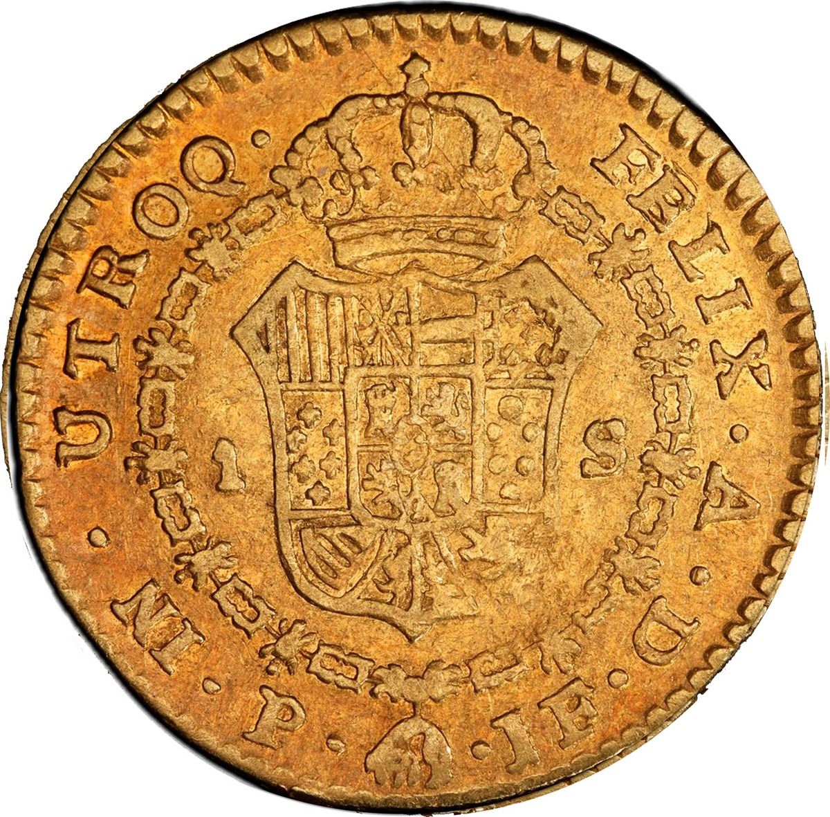 COLOMBIA, Popayán, gold bust 1 escudo, Charles IV, 1801 JF, PCGS VF30. Restrepo-85.20; Cal-1160; KM-56.2; Fr-59. Choice luster for the assigned grade, with traces of light red toning, weakly struck bust and natural flaw at bottom-right part of shield.