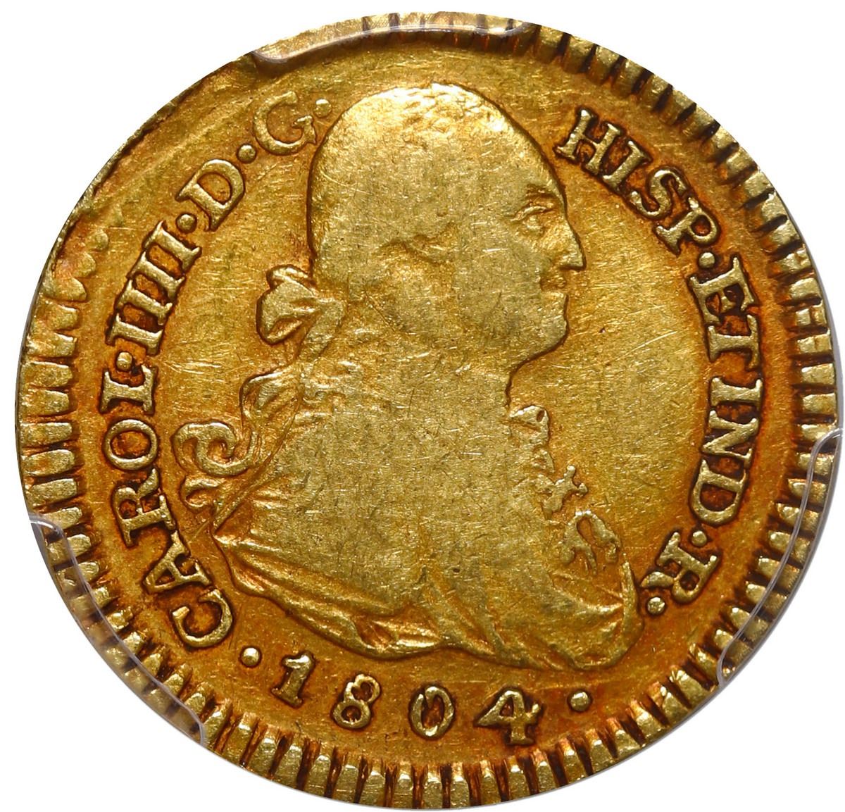 COLOMBIA, Popayán, gold bust 1 escudo, Charles IV, 1804 JT, PCGS VF30, finest and only example in PCGS census. Restrepo-85.28; Cal-1164; KM-56.2; Fr-59. Broad flan with choice full rims outside of lovely red toning, weakly struck centers, better assayer for this date, this example in fact the finest at PCGS with none at NGC.