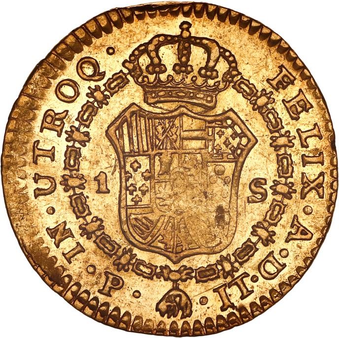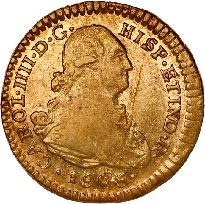 COLOMBIA, Popayán, gold bust 1 escudo, Charles IV, 1805 JT, ex-JEAS. Restrepo-85.32; Cal-1167; Fr-59; KM-56.2. 3.35 grams. Very lustrous AU with weak centers, diagonal planchet-flaw in front of bust, parts of rims crude (as made). Pedigreed to the JEAS Collection.