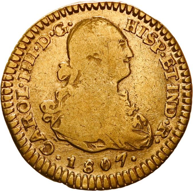 COLOMBIA, Popayán, gold bust 1 escudo, Charles IV, 1807 JF. Restrepo-85.38; KM-56.2; Cal-1170; Fr-59. 3.31 grams. VF with light cleaning.