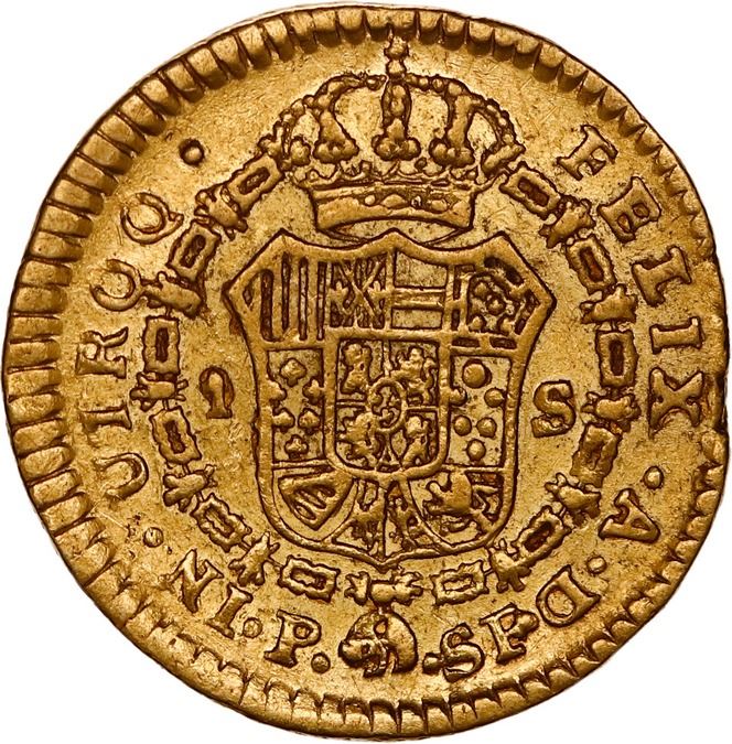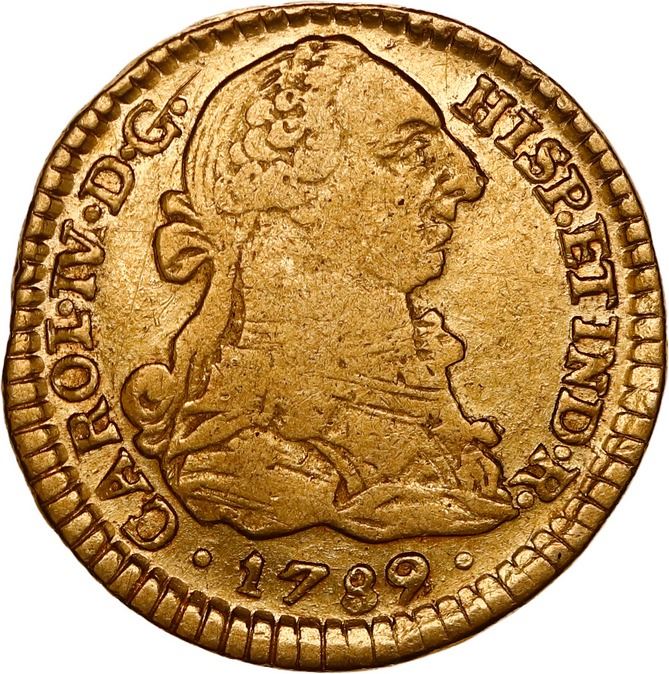 COLOMBIA, Popayán, gold bust 1 escudo, Charles IV transitional (bust of Charles III, ordinal IV/III), 1789/8 SF, re-punched HISP• ETIND, ex-JEAS. Restrepo-83.1a; Cal-1144; Fr-50; KM-54.2. 3.35 grams. Lustrous XF/AU with weakly struck bust, minor rim-flaw and marks, interesting die-variety. Pedigreed to the JEAS Collection.