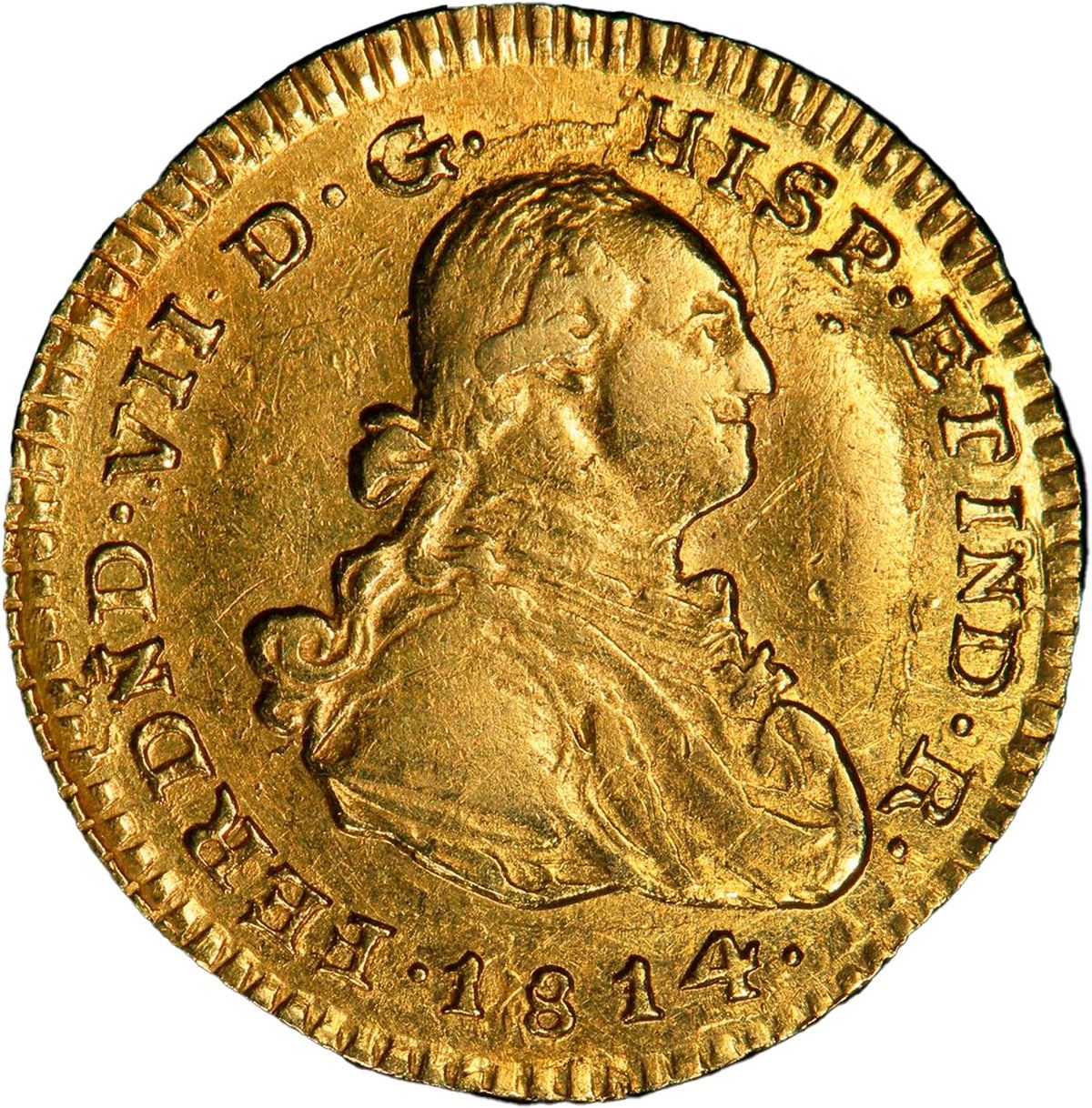 COLOMBIA, Popayán, gold bust 1 escudo, Ferdinand VII (bust of Charles IV), 1814 JF, PCGS AU50. Restrepo-123.13; Cal-1530; 64.2; Fr-66. Very flashy with luster and light cleaning, full rims, minor die-buckling, second finest in PCGS census behind a single AU55 (and none finer at NGC).