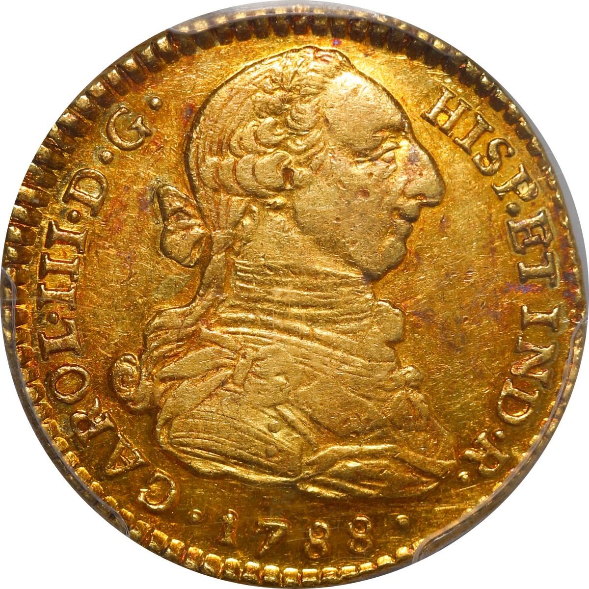 COLOMBIA, Popayán, gold bust 2 escudos, Charles III, 1788 SF, PCGS AU55, finest known in PCGS census, ex-Eldorado. Restrepo-62.26; Cal-1647; KM-49.2; Fr-40. Choice bright luster with lovely red toning, full rims, tied for finest certified with two at same grade at NGC. Pedigreed to the Eldorado Collection (Stack's Bowers auction of August 2018, lot 40209.