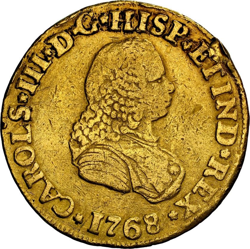 COLOMBIA, Popayán, gold bust 2 escudos, Charles III (bust of Ferdinand VI), 1768 J, NGC VF details / damaged, ex-Becerra. Restrepo-58.12; KM-36.2; Cal-1620; Fr-28. Light yellow color with sediment in crevices, some surface marks but also several nicks and file marks on edge. Pedigreed to the Becerra Collection (stated on label).