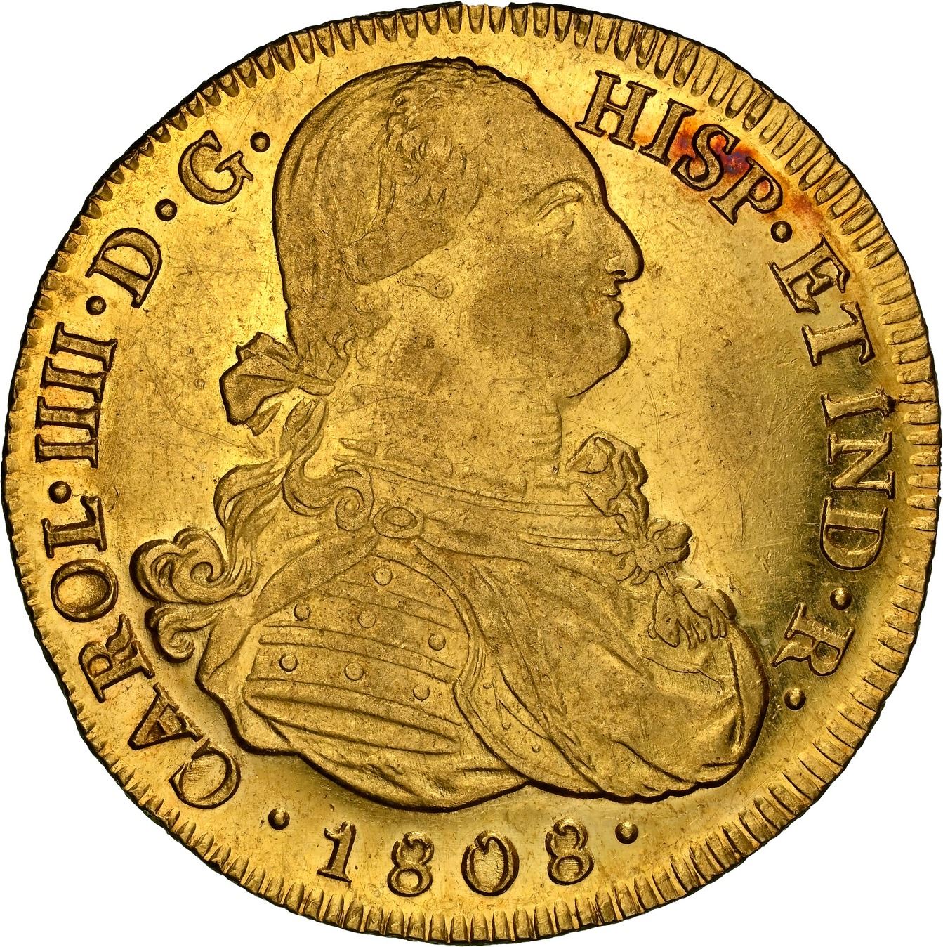 COLOMBIA, Popayán, gold bust 8 escudos, Charles IV, 1808 JF, NGC AU 58. Restrepo-98.38; KM-62.2; Cal-1690; Fr-52. Highly lustrous for the assigned grade, which appears to be based on the weak central details due to obvious die-buckling on both sides, attractively flashy, listed as scarce in Restrepo.