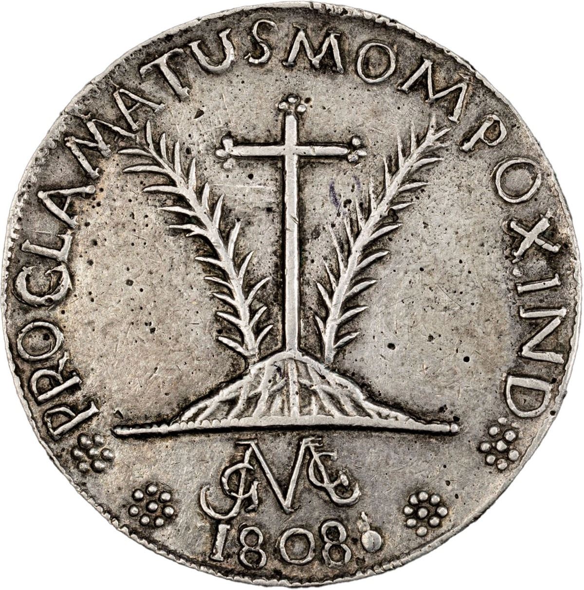 COLOMBIA, Santa Cruz de Mompox, cast 4 reales-sized proclamation medal, Ferdinand VII (imaginary bust), 1808, extremely rare, PCGS XF details / repaired, finest known in PCGS census. Restrepo-14 (p. 130); Herrera-78; Medina-381. 33 mm. Obverse with imaginary bust of Ferdinand VII within legend [rosette] FERDINANDUS.VII.REXHISPAN. [rosette] ETIND• with last N in retrograde; reverse with tall cross between two palm branches on a mound within legend [rosette] PROCLAMATUSMOMPOX.IND. [rosette] with [rosette] 1808. [rosette] below monogram for the region's Alférez Real Gabriel Martínez Guerra. Somewhat crude in design but with sharp details and light toning, just a few old marks and with fields typically chased (smoothed in its time) as seen on most cast proclamation medals (which PCGS considered "repaired"), acknowledged as one of the rarest Colombian proclamations of Ferdinand VII, missing in most collections and represented only as a drawing in all references including Restrepo. This example is visibly superior to the only other piece we know to have been sold in recent years (the Becerra Collection example in Sedwick Auction 36).