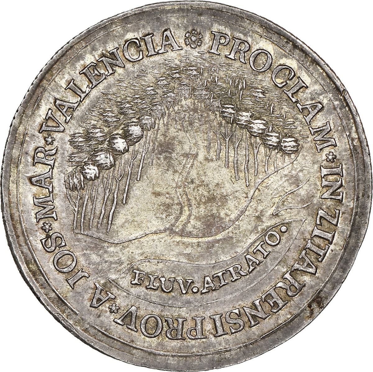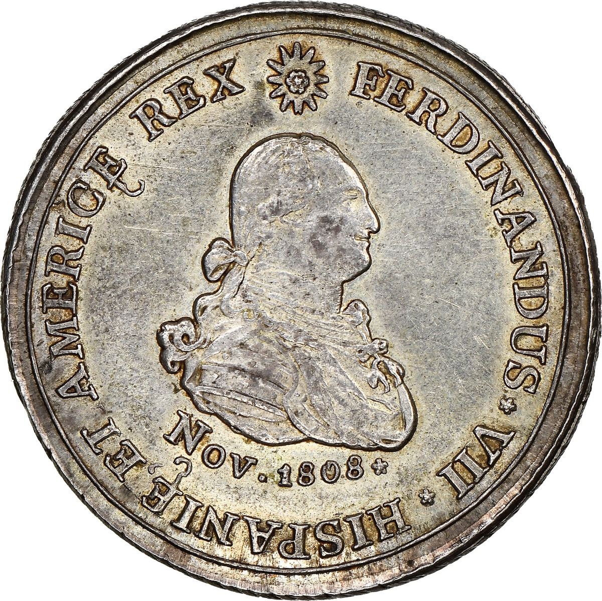 COLOMBIA, Zitará (Quibdó), 4 reales-sized proclamation medal, Ferdinand VII (bust of Charles IV), 1808, extremely rare, NGC MS 62, ex-Nueva Granada, Restrepo Plate. Restrepo-24 (p. 130, this piece); Herrera-unl (cf 92 in gold); Medina-unl (cf 407 in gold). 32.5 mm. Obverse with bust of Charles IV [sic] above Nov.1808* within legend FERDINANDUS * VIII * HISPANIE [cedilla] ET AMERICE [cedilla] REX and rosette within sun; reverse with forest above river FLUV.ATRATO. within legend PROCLAM * IN ZITARENSI PROV * A JOS * MAR * VALENCIA and rosette; diagonal-grooved edge. Choice green-gold toning over luster (the reverse darker). This issue, probably struck in Popayán, is so rare that only two are known to exist in silver (the other, in fact, being the next lot in this auction). Restrepo's illustration of the present piece says "only one known in silver," with a unique example also known in gold referenced by both Herrera and Medina as "único ejemplar." Citará (here as Zitará) was the original name of the city of Quibdó on the Río Atrato, which terminates in the Gulf of Darién. Note: NGC erroneously labeled this as Valencia (in reference to the city instead of the person). Pedigreed to the Nueva Granada Collection (Sedwick Auction 29, lot 750) and plated on page 130 of Restrepo's Coins of Colombia (2012), both stated on label.