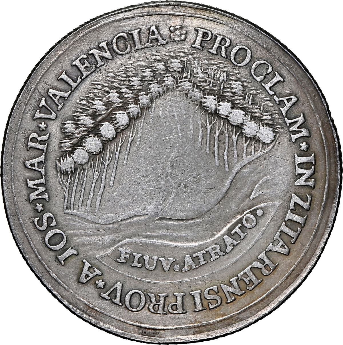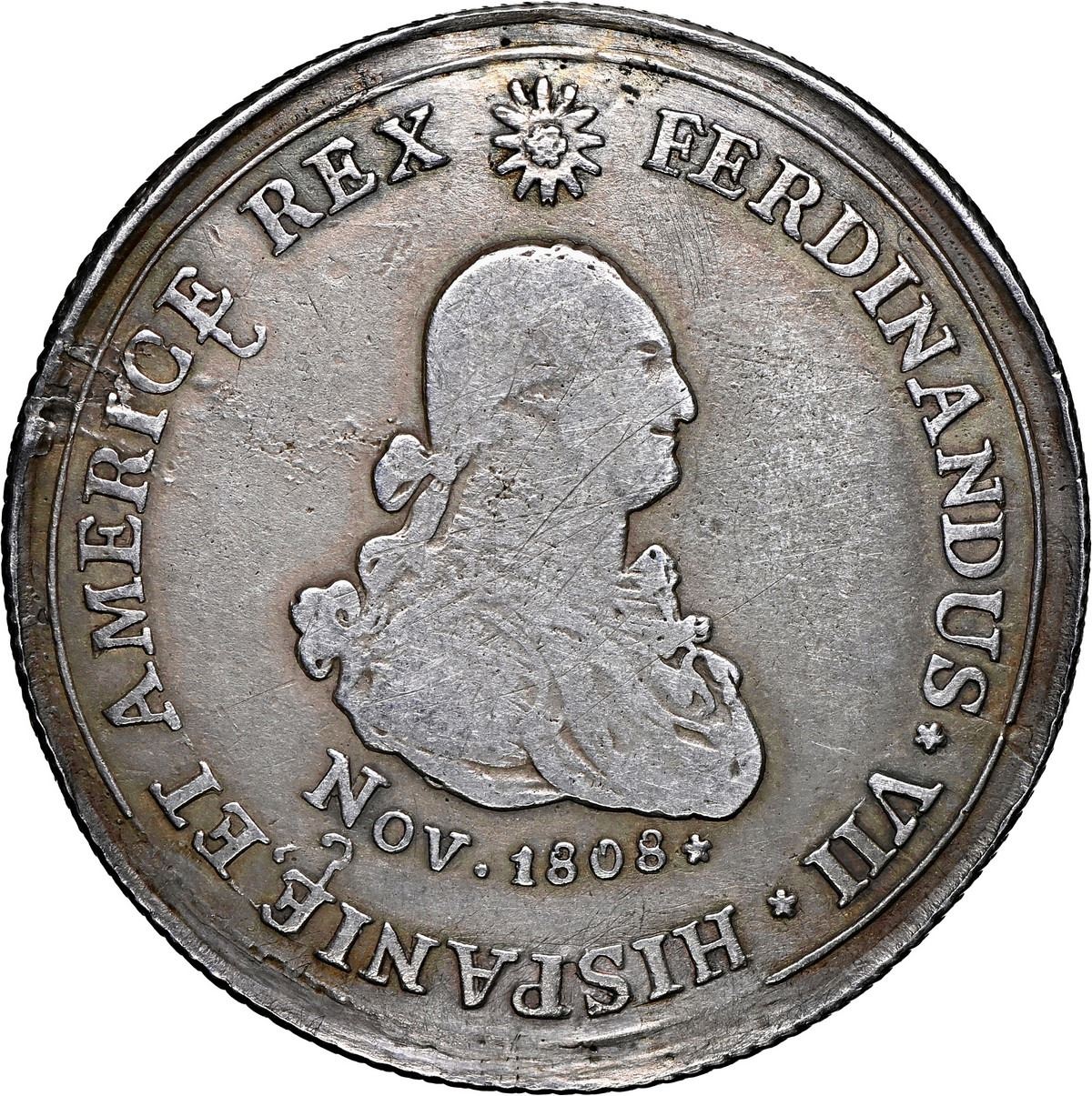 COLOMBIA, Zitará (Quibdo), 4 reales-sized proclamation medal, Ferdinand VII (bust of Charles IV), 1808, extremely rare, NGC VF details / plugged, ex-Isla, ex-Breogán. Restrepo-24 (p. 130); Herrera-unl (cf 92 in gold); Medina-unl (cf 407 in gold). 32.5 mm. Obverse with bust of Charles IV [sic] above Nov.1808* within legend FERDINANDUS * VIII * HISPANIE [cedilla] ET AMERICE [cedilla] REX and rosette within sun; reverse with forest above river FLUV.ATRATO. within legend PROCLAM * IN ZITARENSI PROV * A JOS * MAR * VALENCIA and rosette; diagonal-grooved edge. Lightly toned, with scratches on bust and a few rim-flaws but of course the main damage is the plugged hole at top, yet this issue (probably struck in Popayán) is so rare that this is one of only two known to exist in silver, the other being the previous lot. Citará (here as Zitará) was the original name of the city of Quibdó on the Río Atrato, which terminates in the Gulf of Darién. Note: NGC erroneously labeled this as Herrera-22. Pedigreed to the Celso Isla Collection (Aureo & Calicó auction of April 2021, lot 137) and the Breogán Collection (Aureo auction of October 1998, lot 501).