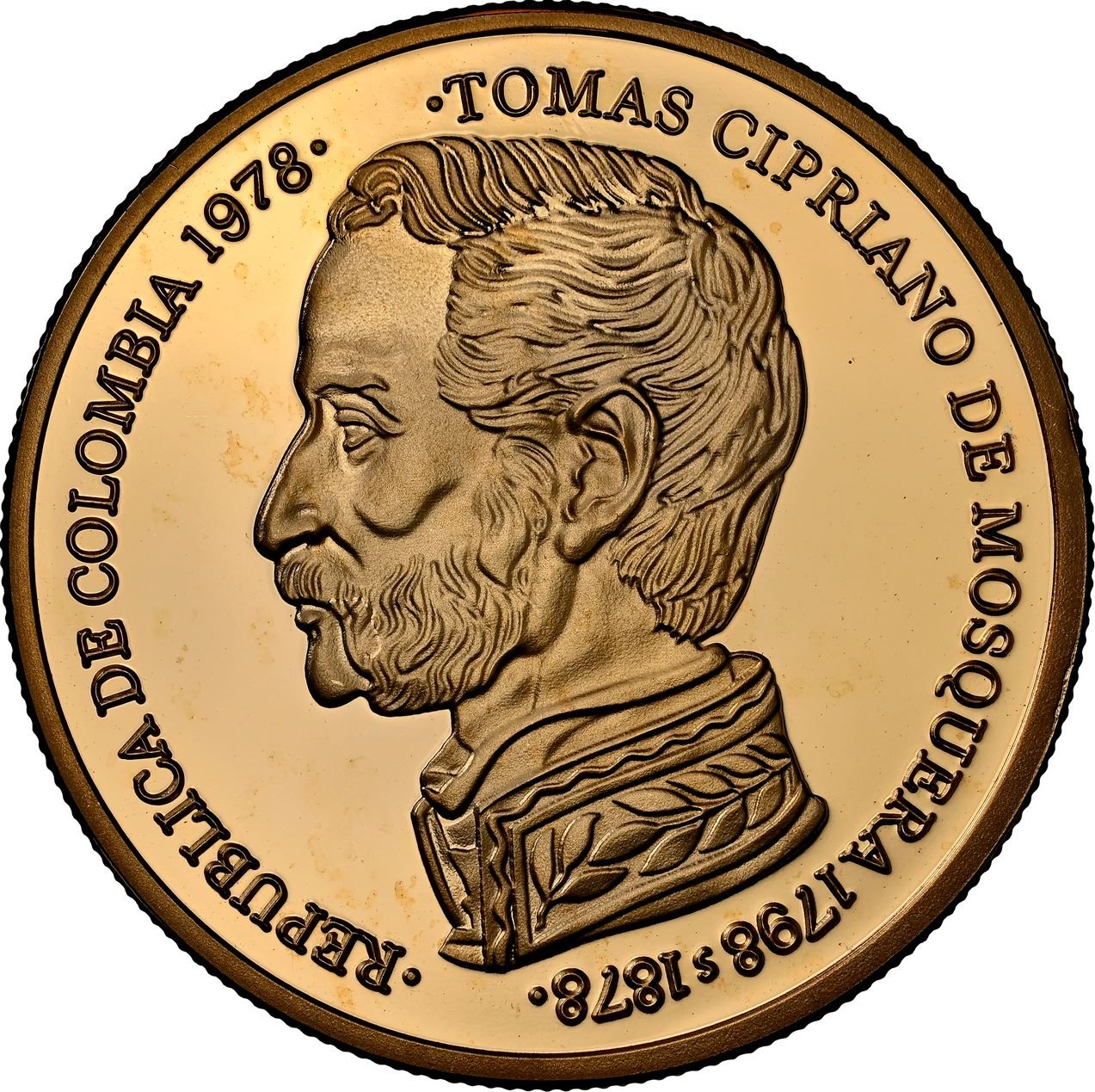 COLOMBIA, gilt brass proof uniface obverse of silver 500 pesos, 1978, 100th Anniversary of the Death of Tomás Cipriano de Mosquera / Wildlife Conservation Series - Crocodile, NGC PF 68 Ultra Cameo, ex-JEAS. Restrepo-pp. 266-7; for type: KM-264. Choice mirror fields, no marks at all and with only the faintest spot of copper, probably rare, a curious instance of a gold finish on brass flan for a silver-coin die, the reverse of which would show a crocodile. Pedigreed to the JEAS Collection (stated on label).
