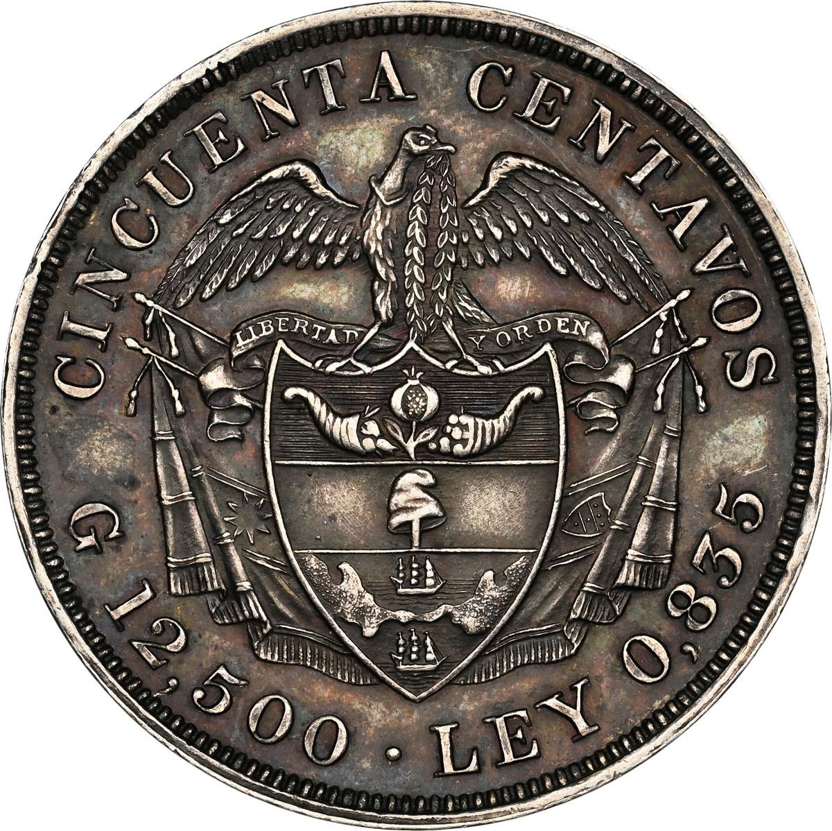COLOMBIA, specimen pattern 50 centavos, 1891, Colombus, lettered edge, unique(?), NGC AU 53, finest and only example in NGC census. Restrepo-P46 var. Bold strike with deep, rich toning contrasting with antique silver high points on the relatively high-relief bust of Columbus, notable for the incuse lettering DIOS LEI LIBERTAD on edge without CASA DE MONEDA per Restrepo-46 (NGC label says "P48 VAR" in reference to an edge-lettered copper pattern instead), in any case currently the only example recorded in the NGC census and the only one we know of in silver (XRF-tested at 95% fine) as opposed to copper. This design (with normal-relief bust) was later adopted for the 1892 coinage commemorating the 400th anniversary of Columbus’ discovery of America. This is an important coin for the Colombian half dollar specialist.