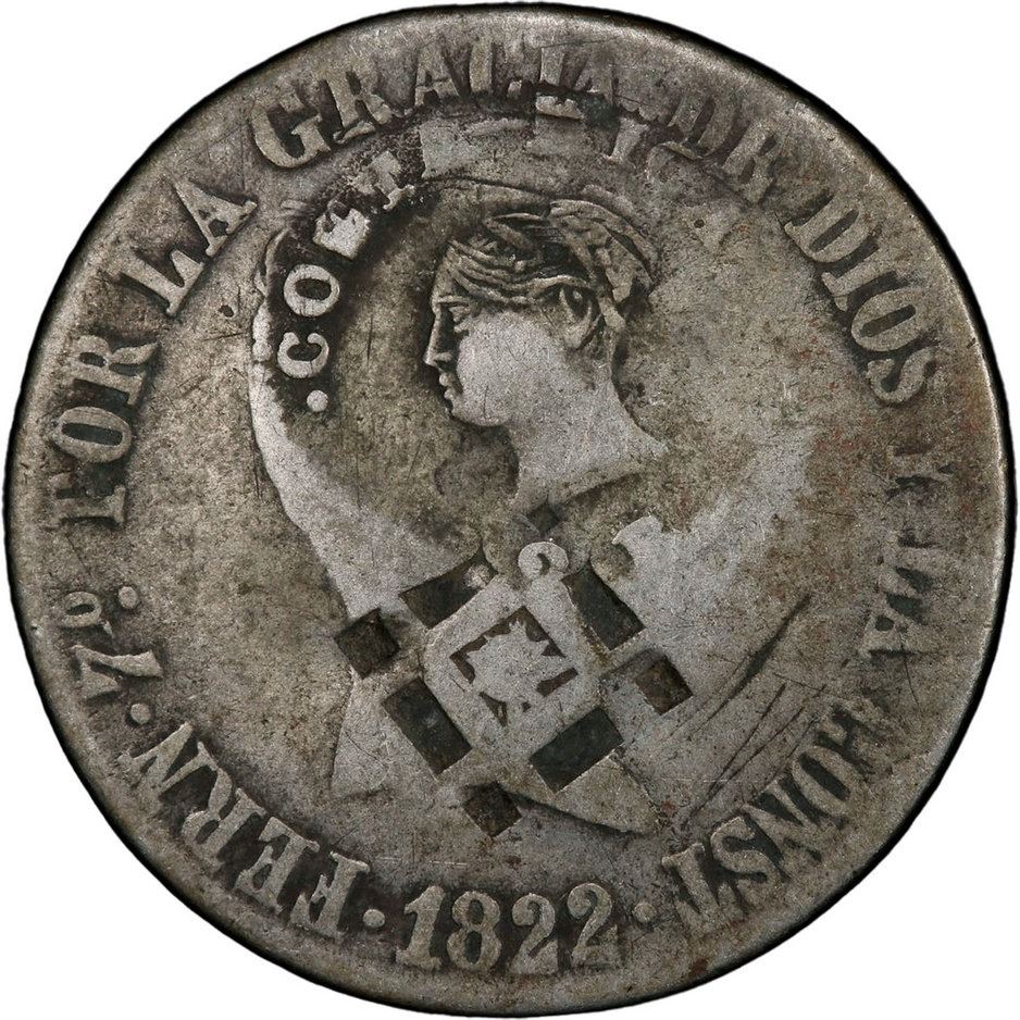 COSTA RICA, 2 reales, female head / ceiba tree counterstamp (Type III, 1845) on a Cuba (Trinidad / Santiago / Principe) 2 reales lattice countermark (1841) on a Madrid, Spain, bust 2 reales, Ferdinand VII, 1822 SR, PCGS VG10 / c/m VF detail, finest and only example in PCGS census. KM-44. Interesting triple-country issue in a rare straight-grade holder, with all three countermarks clear (nearly full) and the host date and mintmark also quite prominent, lightly toned all over but strongly so in crevices, also a rare host type.