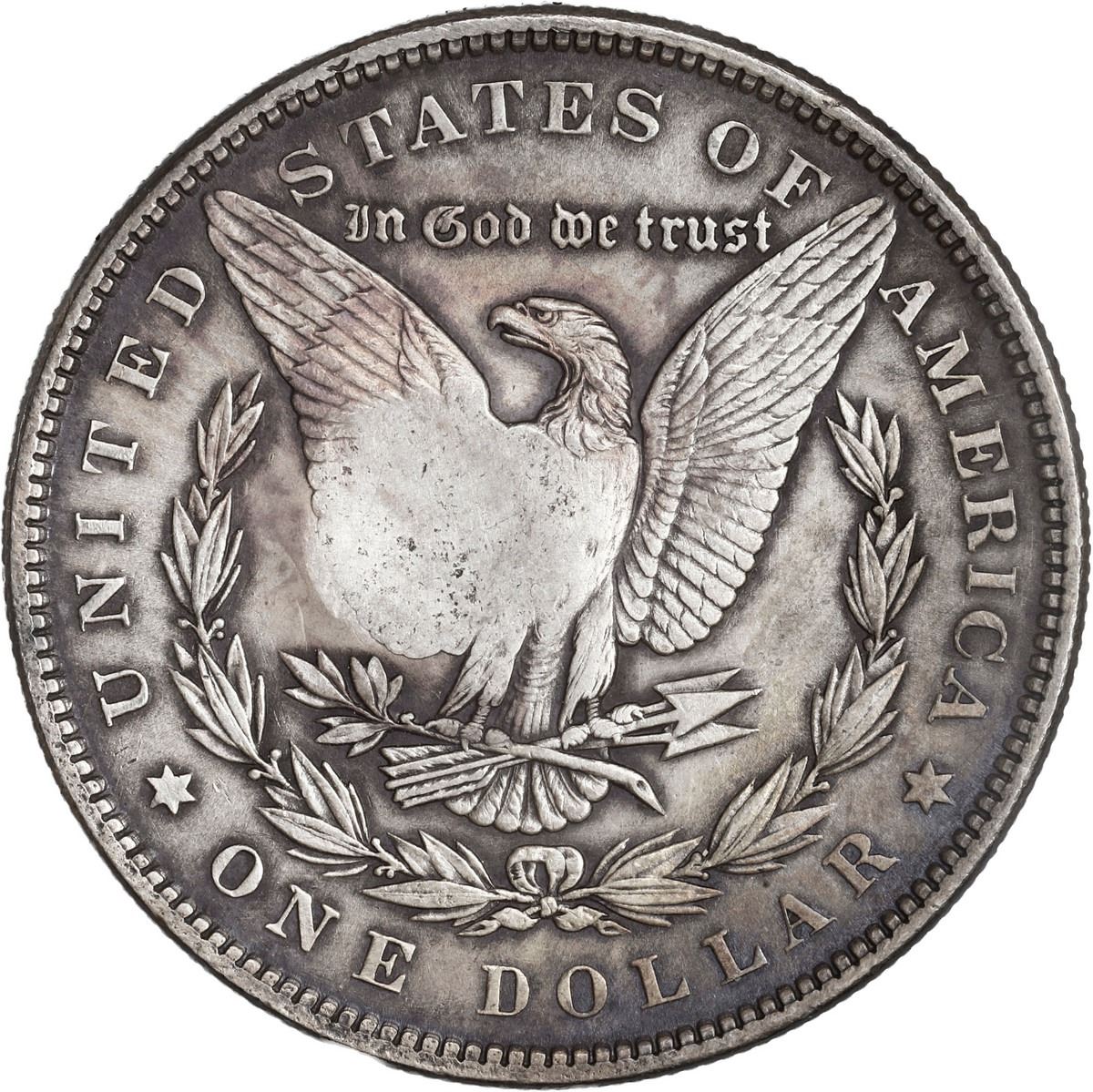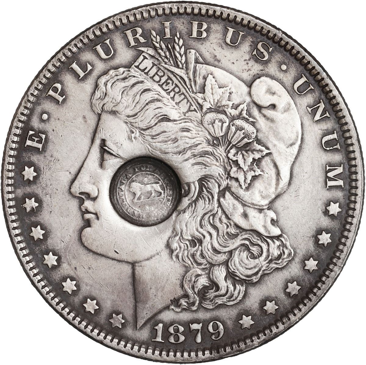 COSTA RICA, 8 reales, "lion" countermark (Type VI, 1849-57, later restrike with original rusty die) on the obverse of a USA Morgan dollar of 1879. Bruce-X20. A spurious issue but documented in the Standard Catalog of Unusual World Coins and still of interest to Costa Rican collectors anyway. Deeply struck AU countermark on an XF host coin with richly toned surfaces.