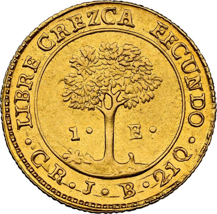 COSTA RICA (Central American Republic), San José, gold 1 escudo, 1849 JB, NGC AU 58. KM-14; Fr-4. Choice luster, no marks or wear but the tree side perhaps very slightly grainy, in any case high grade for this issue.