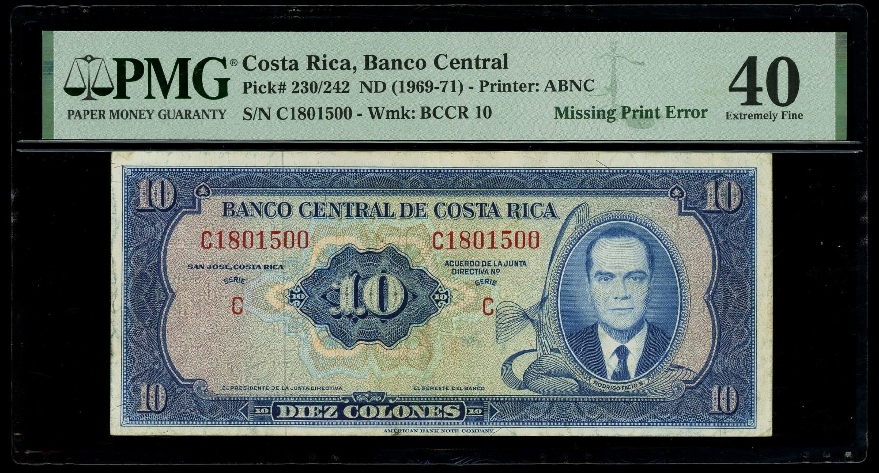 COSTA RICA, San José, Banco Central, 10 colones, no date (1969-71), series C, serial C1801500, missing print error, PMG XF 40. Pick-230/242. The date, signatures, and directiva number are not present on this missing overprint error note.