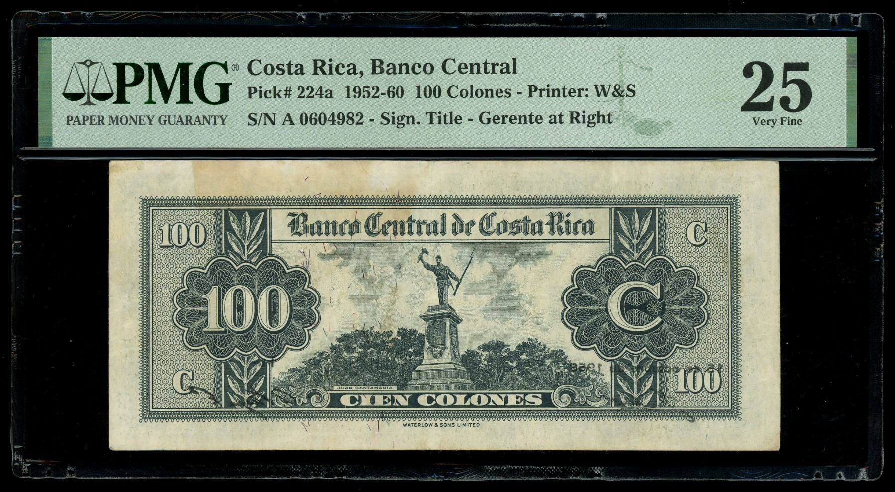 COSTA RICA, San José, Banco Central, 100 colones, 15-10-1958, series A, serial 0604982, offset print