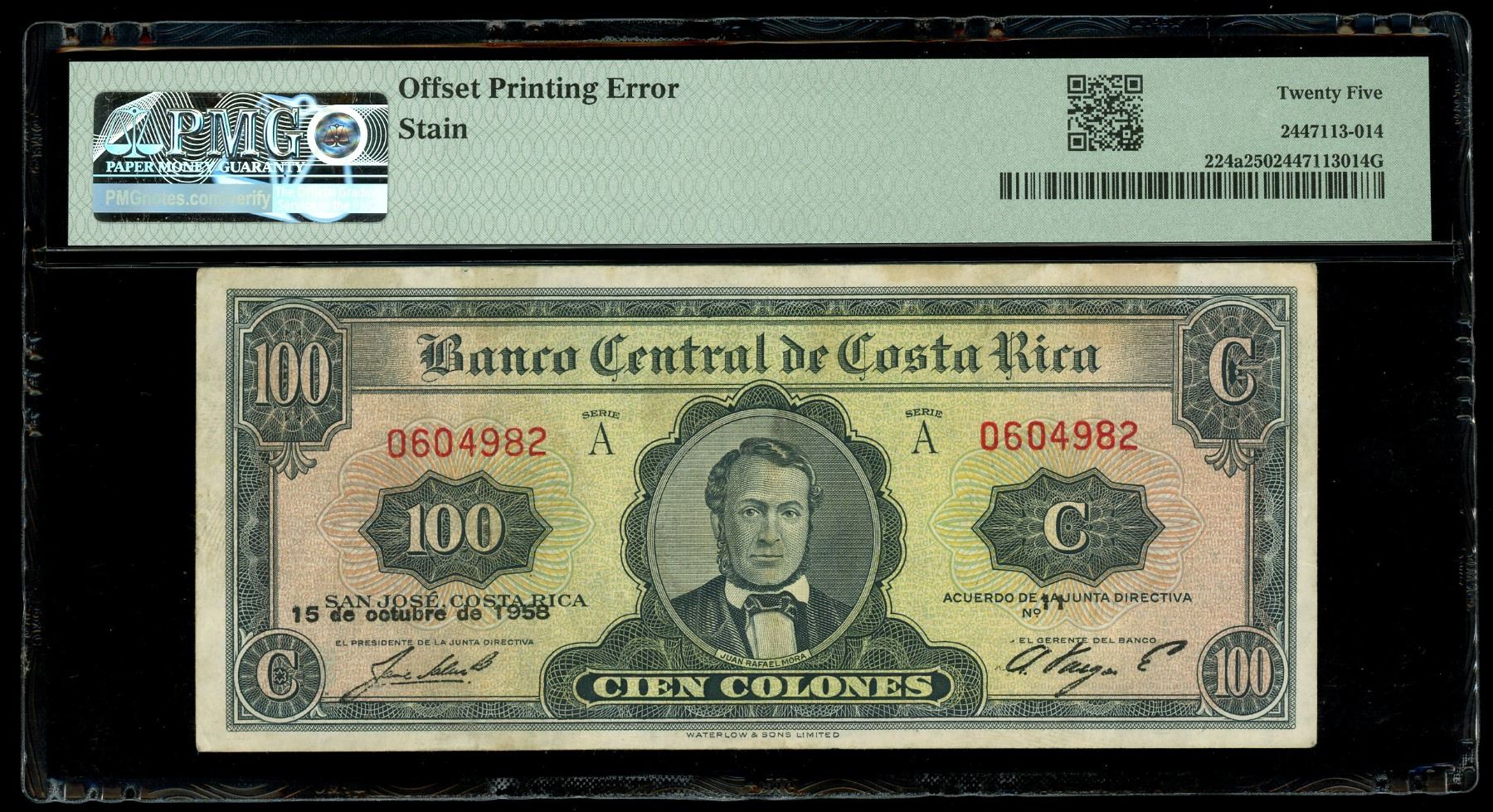 COSTA RICA, San José, Banco Central, 100 colones, 15-10-1958, series A, serial 0604982, offset printing error, PMG VF 25. Pick-224a. Clear offset printing error with the date, signatures, and directiva number seen on the back, some staining noted.