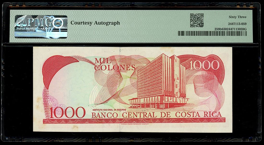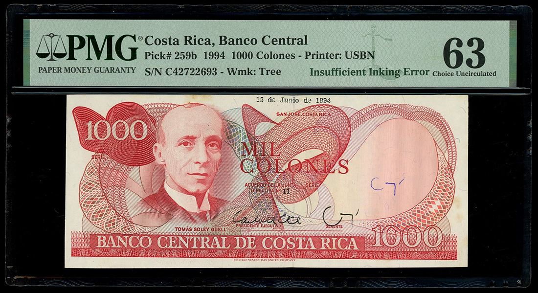 COSTA RICA, San José, Banco Central, 1000 colones, 15-6-1994, series C, serial C42722693, insufficient inking error, courtesy autograph, PMG Choice UNC 63. Pick-259b. One of the most interesting Costa Rican error notes that we've encountered: An insufficient inking error led to missing series letter and numbers on this note, yet close examination shows the serial number embossed and fully visible! Adding to that, a courtesy autograph from the Gerente is seen on the face of the note. A few minor stains are seen in the margins on this otherwise Uncirculated note.