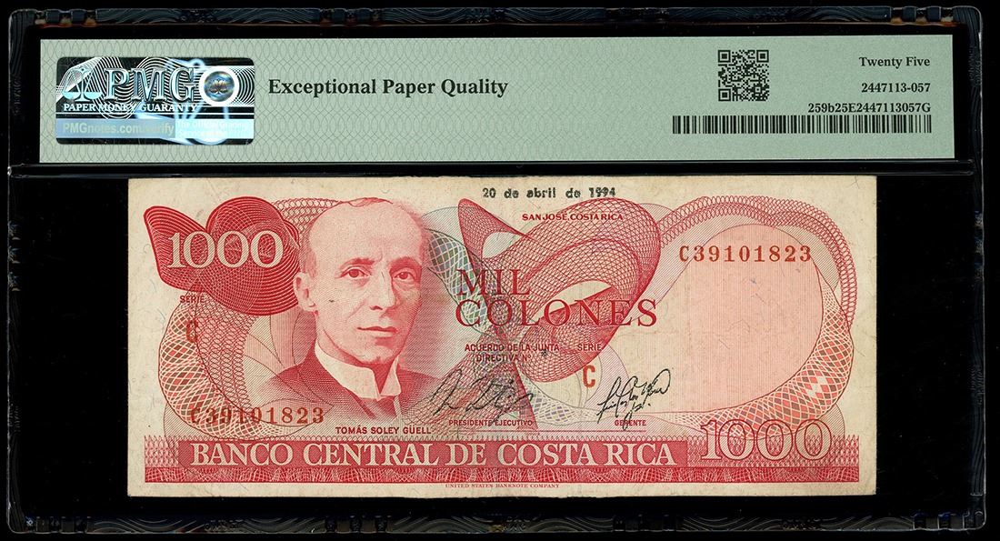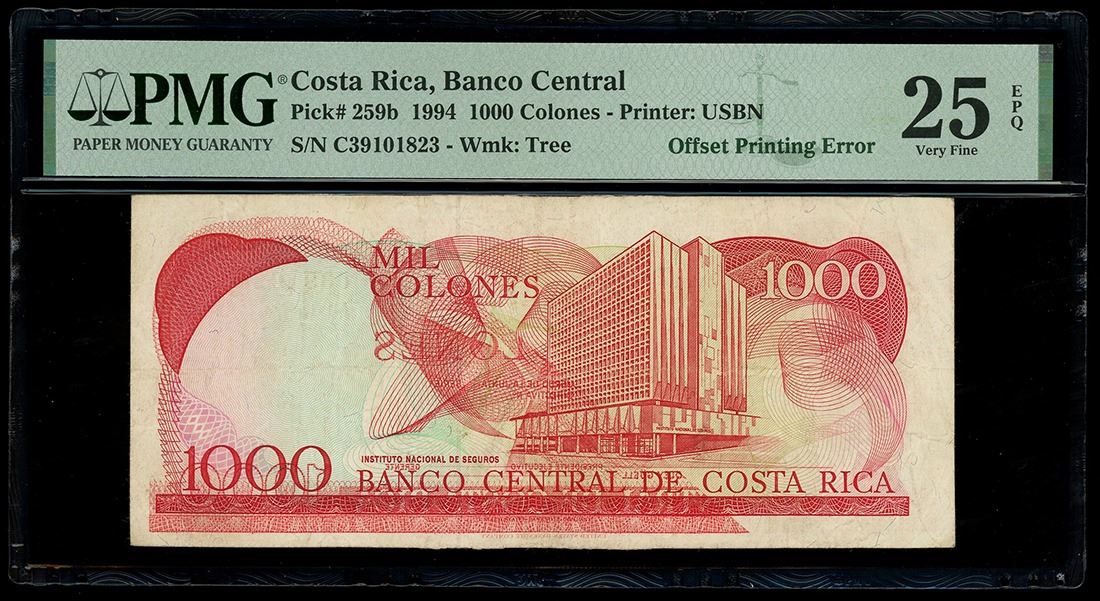 COSTA RICA, San José, Banco Central, 1000 colones, 20-4-1994, series C, serial C39101823, offset printing error, PMG VF 25 EPQ. Pick-259b. Bold partial face-to-back offset printing error seen on this circulated note with EPQ designation.