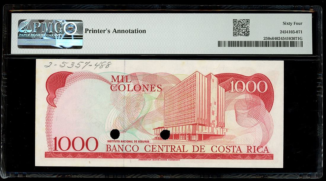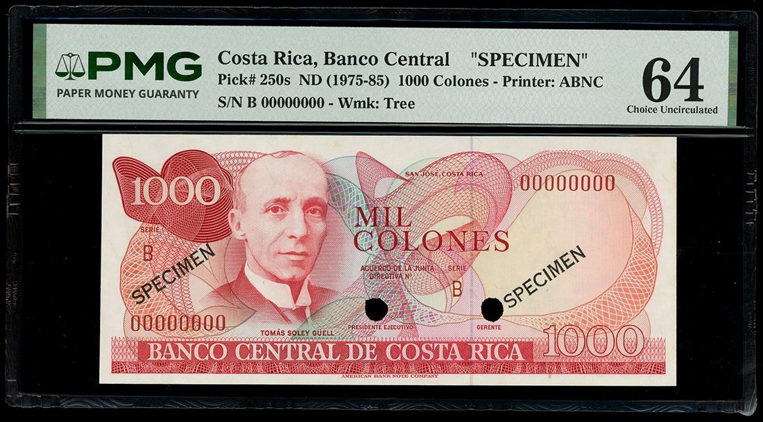 COSTA RICA, San José, Banco Central, 1000 colones specimen, (1975-85), series B, PMG Choice UNC 64. Pick-250s. Two POCs. Bright specimen note with pencil printer's annotation on the back, a few paper toning spots.