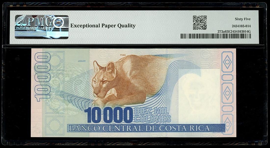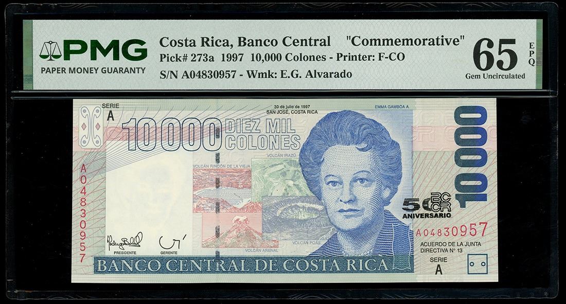COSTA RICA, San José, Banco Central, 10000 colones, 30-7-1997, series A, serial A04830957, commemorative, PMG Gem UNC 65 EPQ. Pick-273a. Bold design on this 50th anniversary of the Banco Central commemorative high-denomination note.