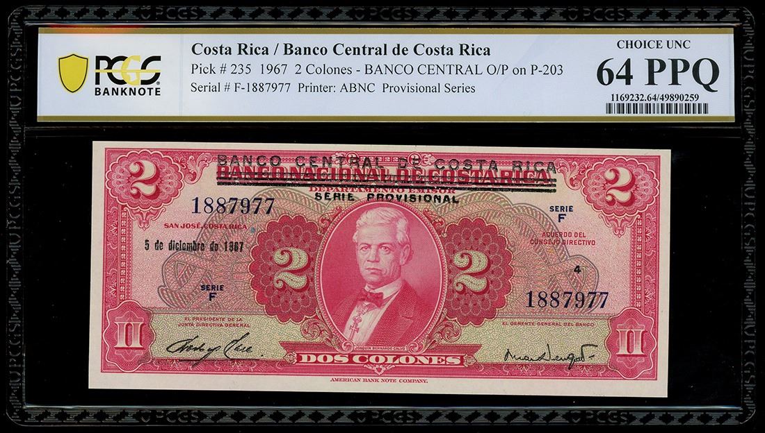 COSTA RICA, San José, Banco Central, 2 colones, 5-12-1967, series F, serial 1887977, black overprint on Banco Nacional 2 colones, PCGS Banknote Choice UNC 64 PPQ, finest known in PCGS census. Pick-235. Boldly embossed black Banco Central overprint on this Banco Nacional host note with nice margins and red ink colors.