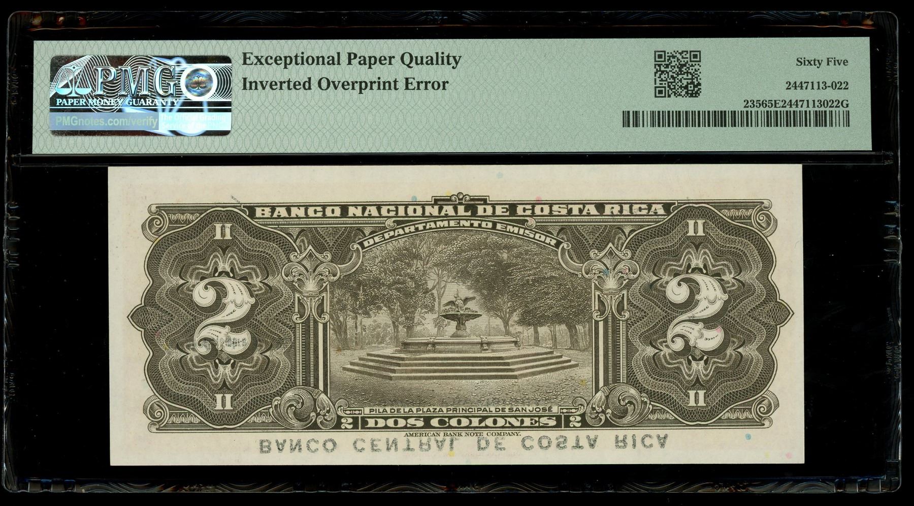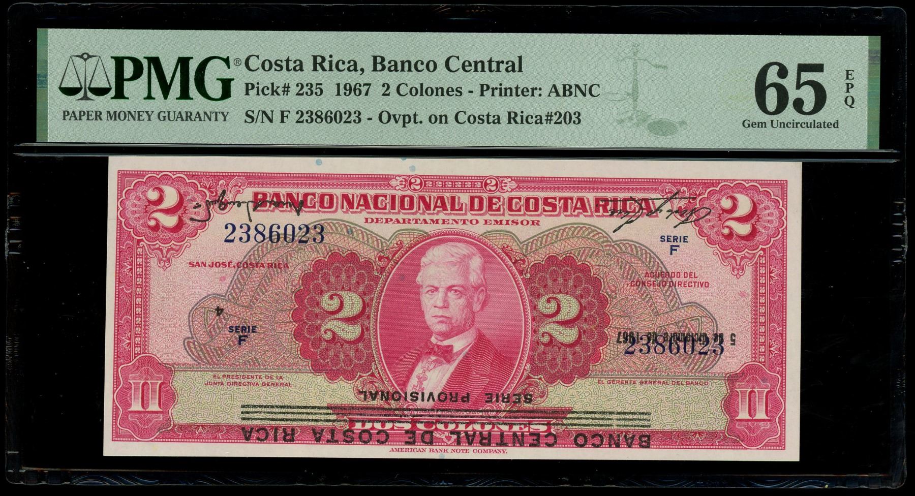 COSTA RICA, San José, Banco Central, 2 colones, 5-12-1967, series F, serial 2386023, inverted overprint error, PMG Gem UNC 65 EPQ. Pick-235. A Gem note with dramatic error showing the Banco Central overprint upside down across the face.