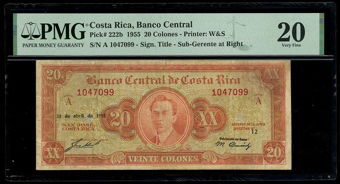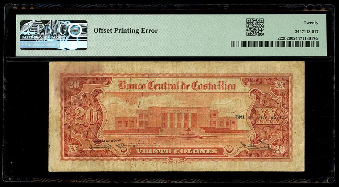 COSTA RICA, San José, Banco Central, 20 colones, 20-4-1955, series A, serial 1047099, offset printing error, PMG VF 20. Pick-222b. Clear date, signature, and directiva number overprint visible on the back of this 20 colones due to an offset printing error.