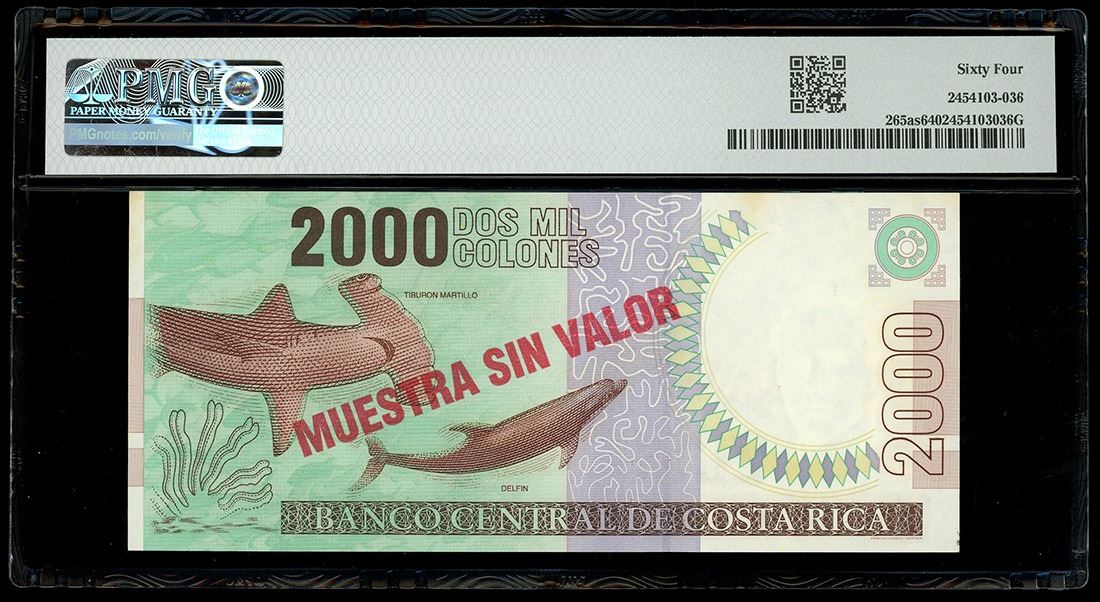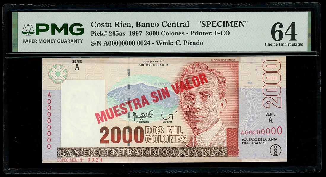 COSTA RICA, San José, Banco Central, 2000 colones specimen, 30-7-1997, series A, PMG Choice UNC 64. Pick-265as. Specimen number 24 as noted in the margin. Bold red MUESTRA SIN VALOR overprint across the face of this specimen note. One of just two in the PMG census.