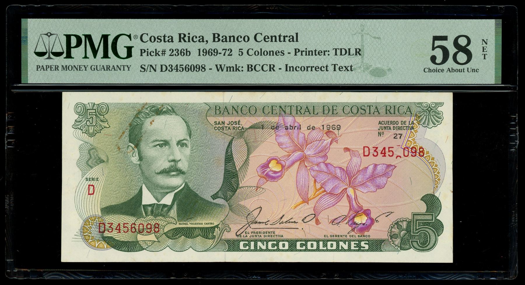 COSTA RICA, San José, Banco Central, 5 colones, 1-4-1969, series D, serial D3456098, incorrect text