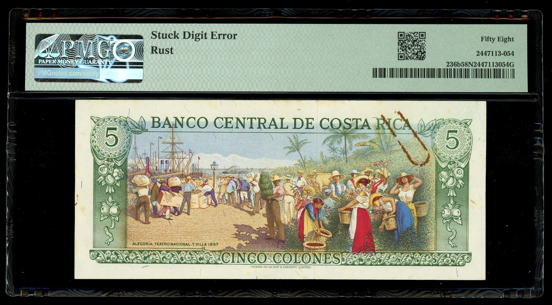 COSTA RICA, San José, Banco Central, 5 colones, 1-4-1969, series D, serial D3456098, incorrect text "T. Villa," stuck digit error, PMG Choice AU 58 NET. Pick-236b. A clear stuck digit error is seen in the middle of the right serial number on this colorful note, while a rust stain from a paperclip is present along the top.