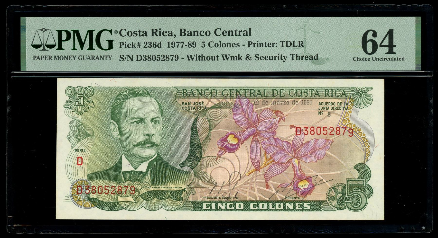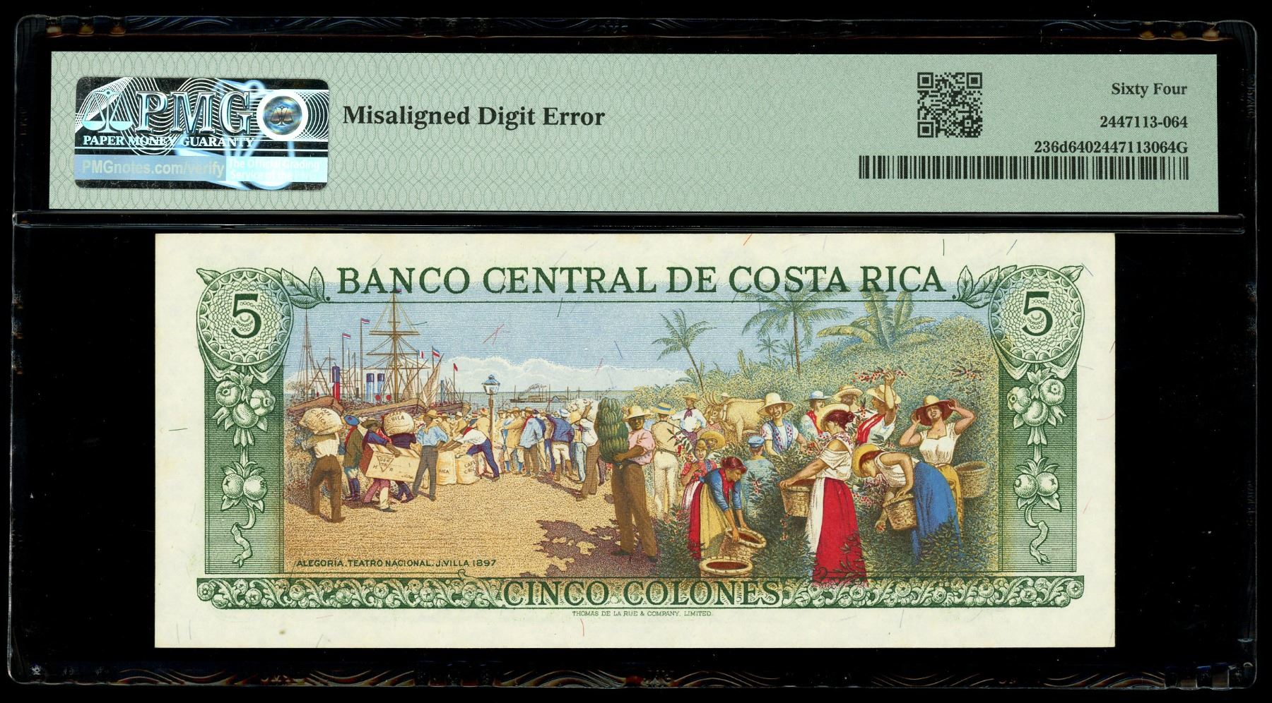 COSTA RICA, San José, Banco Central, 5 colones, 12-3-1981, series D, serial D38052879, misaligned digit error, PMG Choice UNC 64. Pick-236d. A slightly dropped 9 is seen in the right serial number on this colorful error note, with light paper toning seen around the margins.